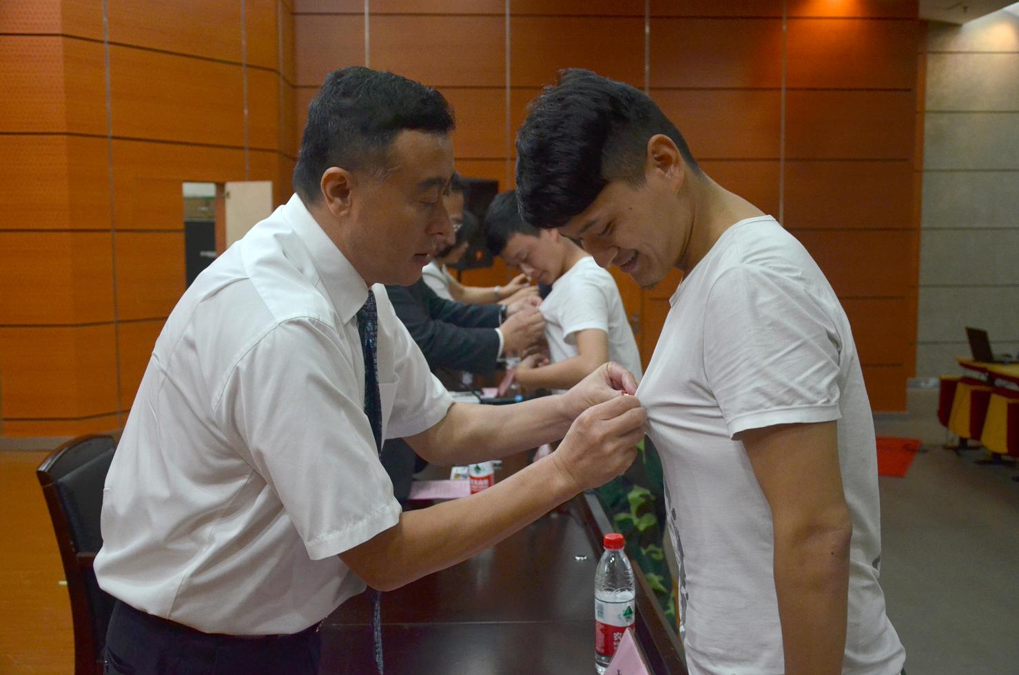 图为嘉宾为新生佩戴校徽