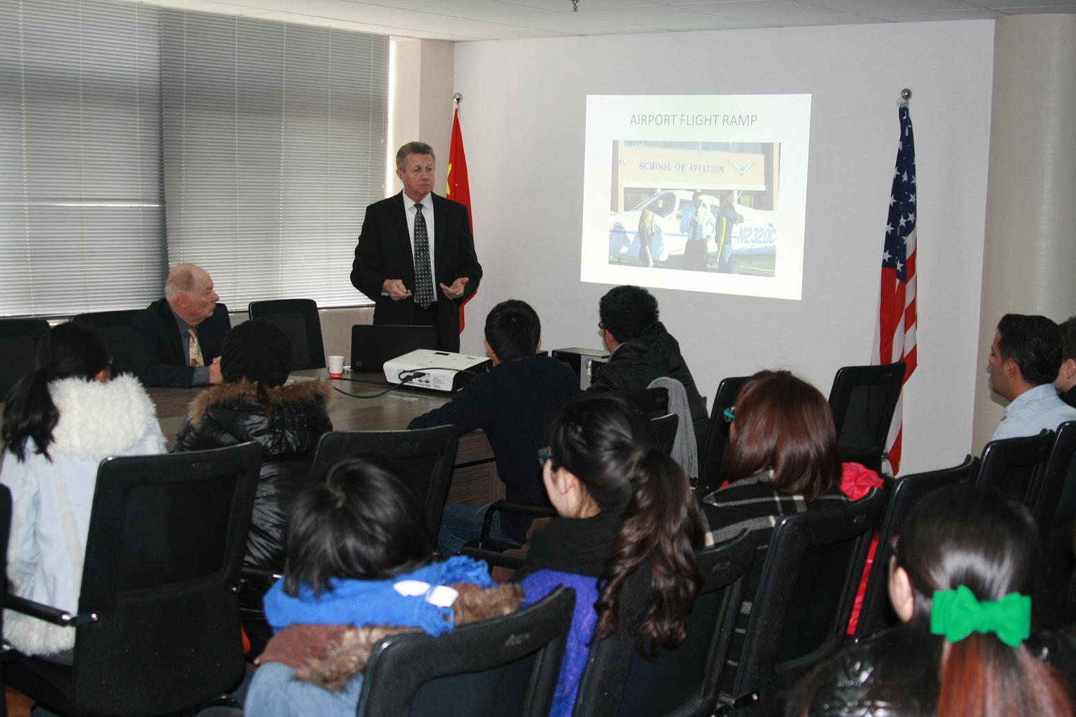 特邀美国著名的航空学校道林大学前来访问。副院长 Thomas Daly与航空飞行教授James Record向我校师生们展示了其数十年从事飞行和飞行教学的经历,美国道林大学优越的教学环境(包括学校机场),并告诉学生们如何达成梦想。两位教授的介绍让在座的师生不禁流露出惊奇与羡艳,并在其后争相恳请签名、合影留念。