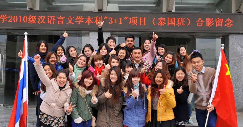 与泰国东方大学合作培养教育项目协议书》,开拓了两校在中文本科“2+2”、“3+1”、中国研究专业硕士学位联合培养等项目的合作办学。这批留学生就是该项目首批来我校学习的泰国东方大学学历生(26名)。他们是在2010年9月,在中国教育部网站完成电子注册,然后先在泰国东方大学学习两年后,于2012年2月来我校继续第三年的专业学习。就读期间,他们主要课程为汉语口语、汉语写作、中国文学、中国书法和太极拳、剪纸、编织等,除此之外他们还积极参与各类中国文化体验活动,并举办宋干节等富有泰国特色的系列活动,为校园文化注入了异国色彩。