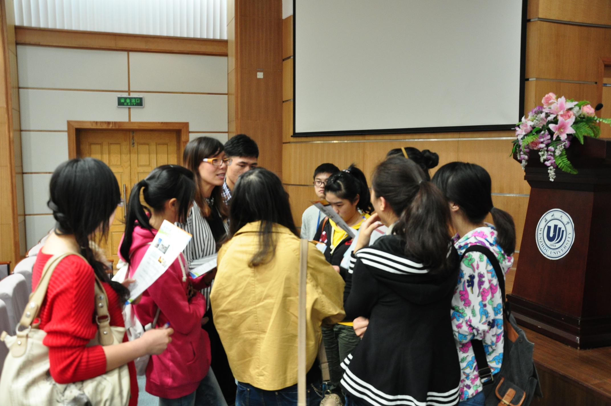 开设的“在校生赴美留学自费交换生项目”、“赴美留学本硕连读项目”、“赴美留学本升硕项目”、“赴美留学库克在校生3+1项目”、“寒暑期赴美语言游学项目”、“赴美带薪实习项目”等6项赴美留学、体验项目,以及各项目优势。最后,包老师从专业特色、校园环境、学生生活、就业环境等方面介绍了与我校合作的4所美方大学,并放映了大量她在各校访问期间所拍摄的照片。其间,周晶晶同学讲述了自己在带薪实习期间的工作、生活、交友及旅游情况。最后,同学们积极提问,并得到了项目老师热情地回答。