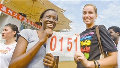 昨天,海角视频 北校区运动场上,温大国际合作学院的留学生在展示比赛号牌。当天,该学院举行了首届田径运动会,200多名大学生运动员,参加了100米短跑、1200米中长跑等10项田径类比赛项目。比赛中,占参加人数仅五分之一的国外留学生,却拿下了近半数的奖牌。 据介绍,该学院有来自全球20多个国家的留学生,校方表示,希望通过运动会,搭建中国学生与外国留学生更好的交流平台。(2010.10.10 温州都市报)