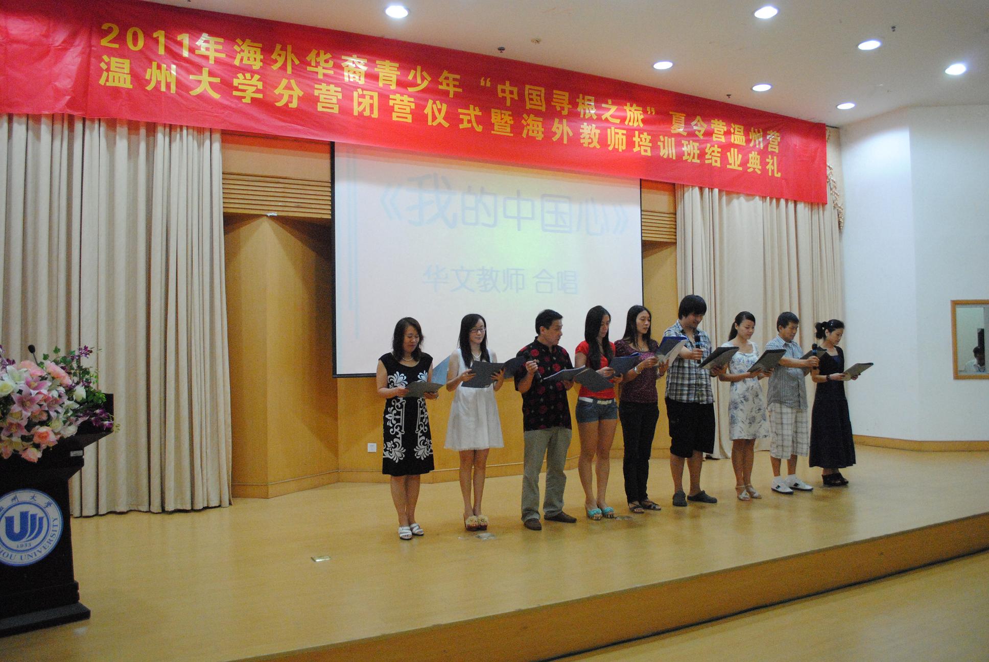 典礼上,海外华校教师合唱了一曲《我的中国心》,获得台下阵阵掌声。本期海外华校教师代表李潇濛在典礼上发言说:“此次培训活动之后,我会带着我在温州所收获到的知识和文化,以全新的姿态投入到汉语教学中来,让我们华裔子女们真真切切地感受我们祖国文化的博大精深,这样也能为华文教育事业献上我的微薄之力”。她代表学员们感谢国侨办和浙江省侨办提供这次难得的学习机会,感谢海角视频