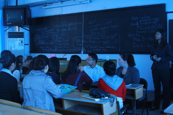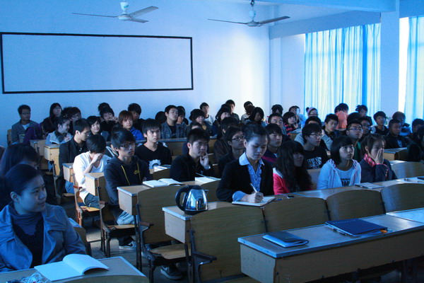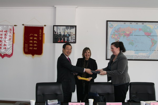 库克项目的基本情况,双方就实际工作中存在的问题和困难进行了探讨。见面会结束后,双方互送了礼物并合影留念。接着,Wendy Gaylord博士一行进行了听课,课堂上学生积极发言、气氛极其活跃。随后,召开了留学生说明会,就库克留学事项及奖学金政策做了详细的说明。会后,对学生的提问进行了一一答复。下午,在601会议室与3位外教召开了见面会。