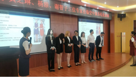 包含丽首先代表学院热烈欢迎国航温州分公司的三位美丽“空姐”,希望同学们通过这次讲座领略航空礼仪之美,体会空中礼仪的高规格和严要求,感受航空运输业一丝不苟、精益求精的服务精神。