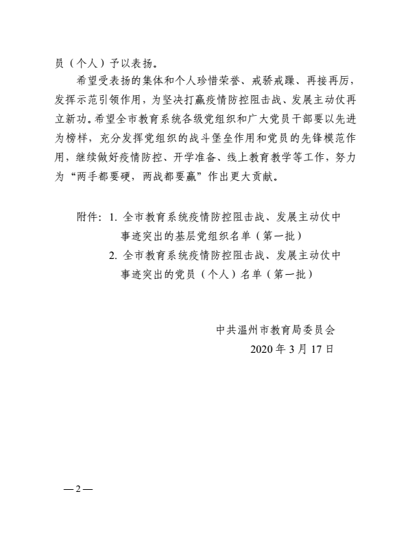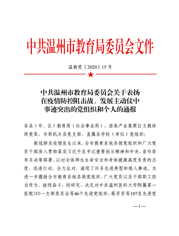 新冠肺炎疫情发生以来,海角视频 总支委员会深入贯彻落实习近平总书记重要批示精神和中央、省市委有关决策部署,以对全体师生生命安全和身体健康高度负责的态度,迅速行动,全力应对,在疫情防控中表现出色,获温州市教育系统疫情防控阻击战、发展主动仗中事迹突出基层党组织称号。