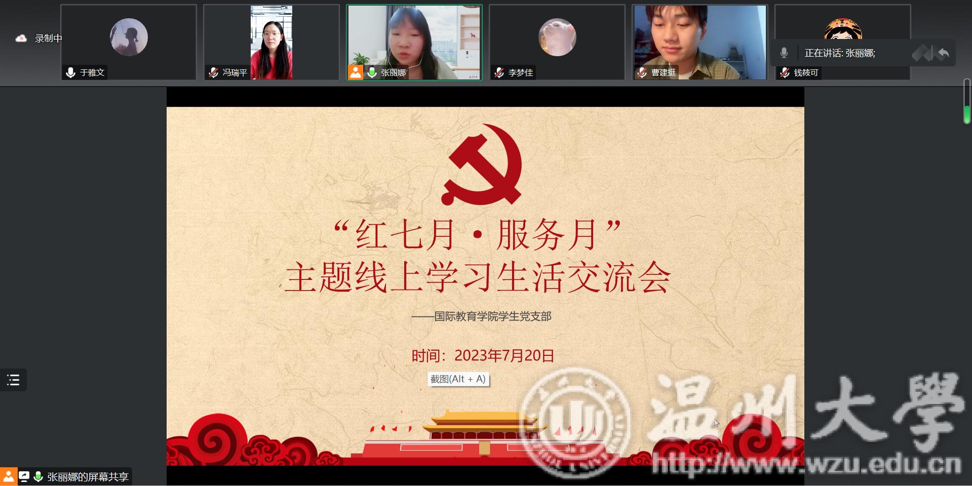 学生党支部于2023年7月20日下午召开“红七月·服务月”主题线上学习生活交流会,会议由学生党员张丽娜同学主持,汉硕学生党员参加。