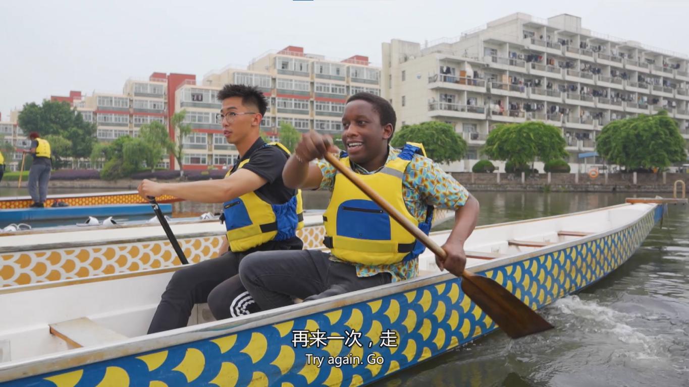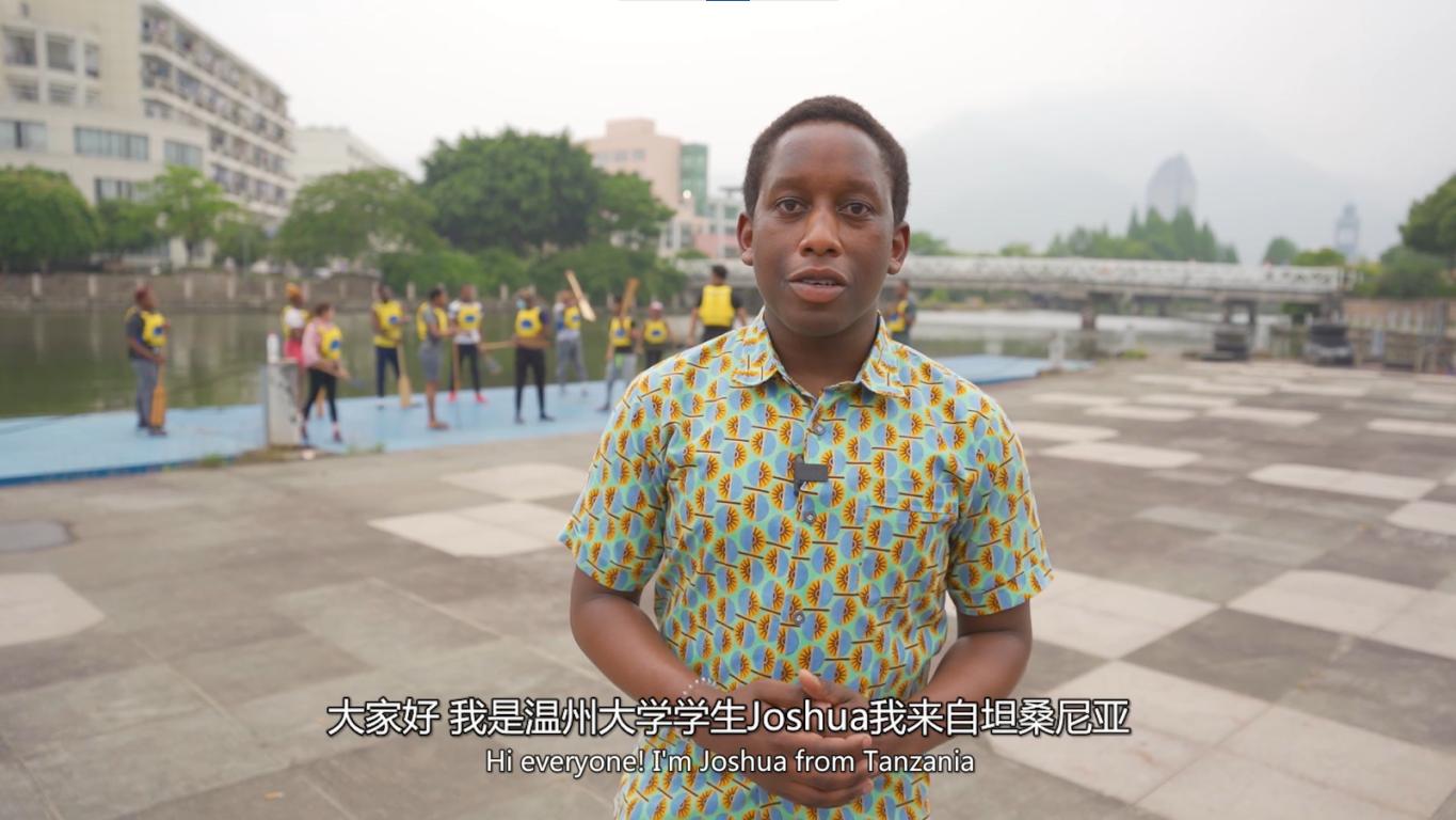两位留学生用流利的中文介绍了他们心中的楠溪江美景和中国传统体育项目划龙舟。苏适安是一名来自意大利的课程与教学论专业硕士研究生,在这里已经生活了3年,她的视频《遇见楠溪江》用3分钟介绍了楠溪江的山水风光和古村落之美,展示了夜晚楠溪江古街的惬意生活和灯光下的美景。最后她在视频中说,在温州我最喜欢的地方就是楠溪江,希望你们也来这里感受它的自然风景,了解古老的历史。陆求是是来自坦桑尼亚的一名计算机科学与技术专业学生,今年大三,是一名爱好中国文化的学生,他的视频《我在中国划龙舟》展现了自己在温大龙舟基地体验划龙舟的经历,视频中他和留学生龙舟队的学生一起做训练热身运动,穿上救生衣学习划桨动作,体验了一把水上龙舟的有趣经历。他说,“龙舟的样子和这项运动都体现了中国传统文化中团结一致向前冲的精神,以后有机会我也想加入龙舟队参加训练。”