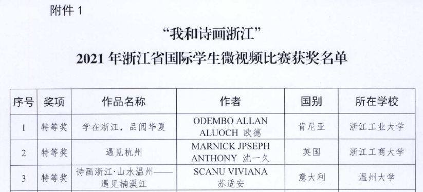 “我和诗画浙江”2021年浙江省国际学生微视频比赛由浙江省教育国际交流协会主办,面向全省高校国际学生,旨在帮助在浙国际学生深入了解浙江的自然风光和人文历史,向世界展示“诗画浙江”的独特魅力,传播中国声音,讲好中国故事,视频作品要求全程用中文介绍讲解,两位留学生都积极参与并展现了高质量的视频作品。