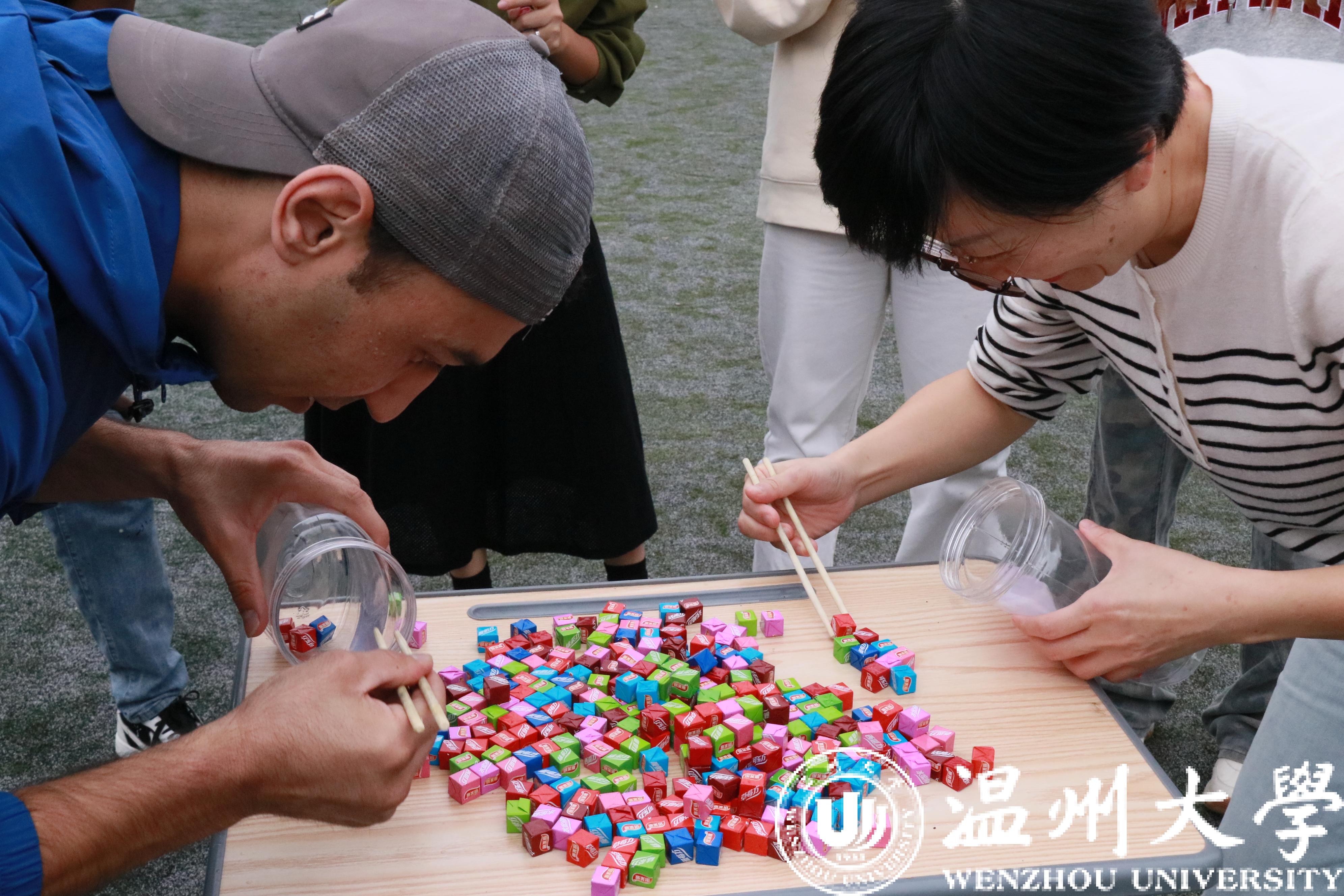 趣味运动会分跳绳比赛、摸石过河、夹糖大战三个个人项目,以及躲避球、心心相印两个团体项目。其中夹糖大战和摸石过河最为有趣,师生们两人一组比赛用筷子夹糖,在一分钟之内夹糖数量最多的一方获胜。比赛迎来了许多师生的围观,大家都想看看中国学生、老师获胜,还是不熟悉使用筷子的留学生获胜。虽然留学生最后没能获得第一名,但是很多留学生选手的夹糖数量依然超过60个,距离第一名仅差几颗糖。摸石过河也是学生积极参与的项目之一,每位参赛者脚底放置两块砖头,参赛选手听到裁判员发出“开始”口令后开始行动,提起左脚并拿起砖头放置前方,随后右脚提起并将右脚下砖头放置前方,如此往复,用时最短的一组获胜,师生们都纷纷铆足了劲往前冲。