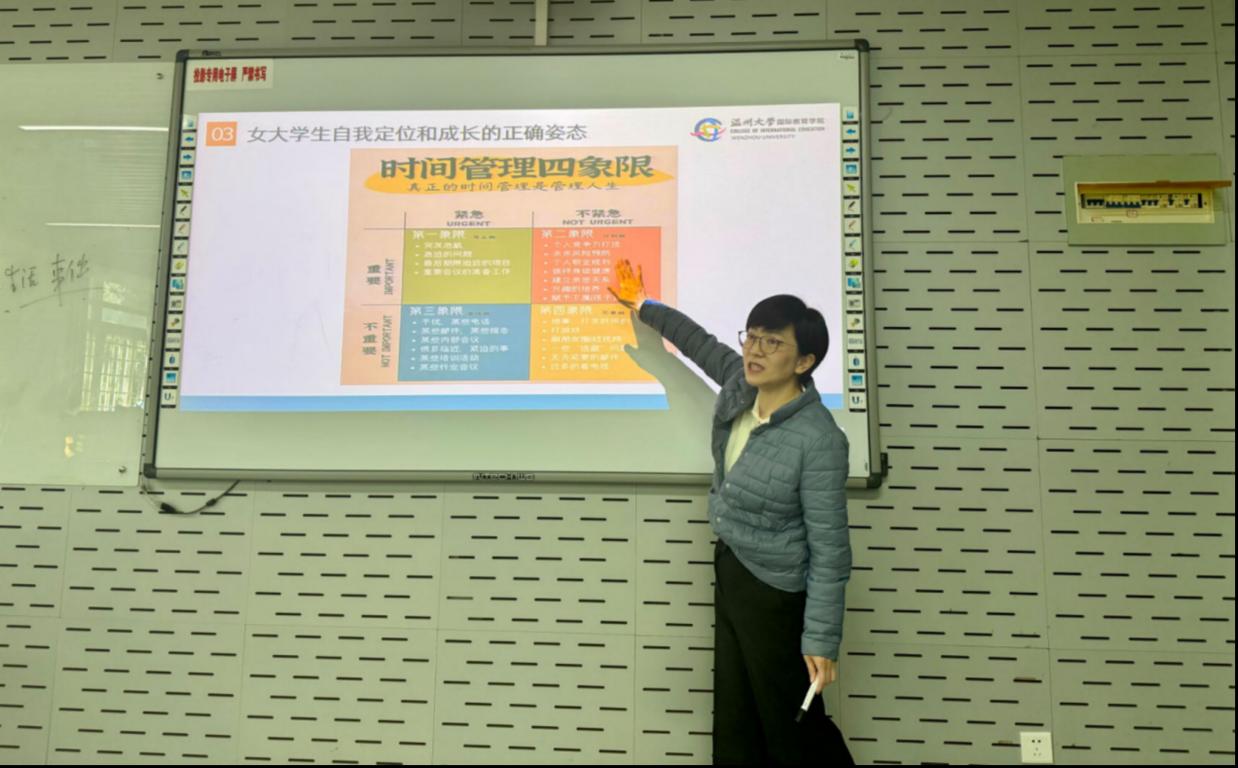 党总支书记林爱菊在3-201报告厅开展“女大学生自我定位和发展”专题讲座,帮助同学们认识自己、了解自己的优势与潜力,引导同学们做好自我管理,搭建自我成长系统,从而更好地实现自我成长和发展。