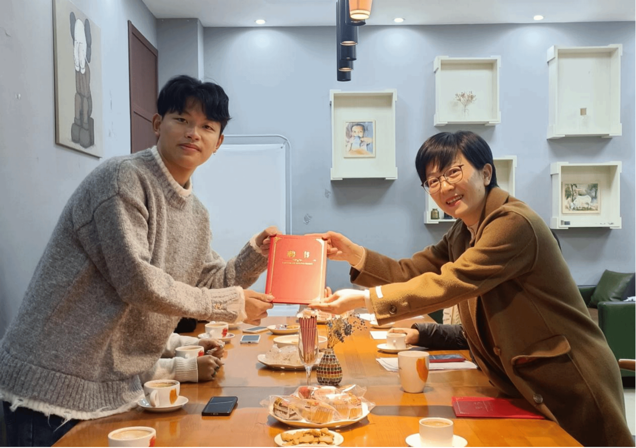 活动伊始,林爱菊书记及熊勇副院长首先对顺利完成学业的交换生们表示最热烈的祝贺,并充分肯定了交换生们在异国他乡的学习中所展现出的勇气、智慧和适应能力,以及为两所大学的交流与合作所做出的积极贡献!随后,林爱菊书记及熊勇副院长为参与本次合作项目的交换生们颁发了结业证书、校友联络员聘书以及学院为他们精心准备的结业礼物,希望同学们能够继续保持开放的心态,积极参与国际合作,为推动世界的发展做出贡献!