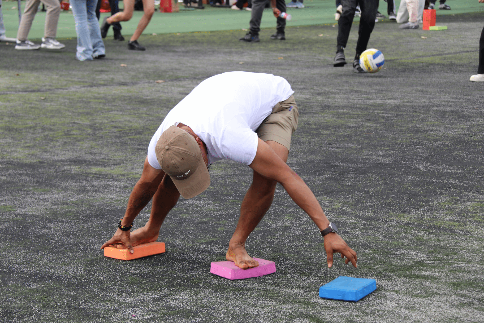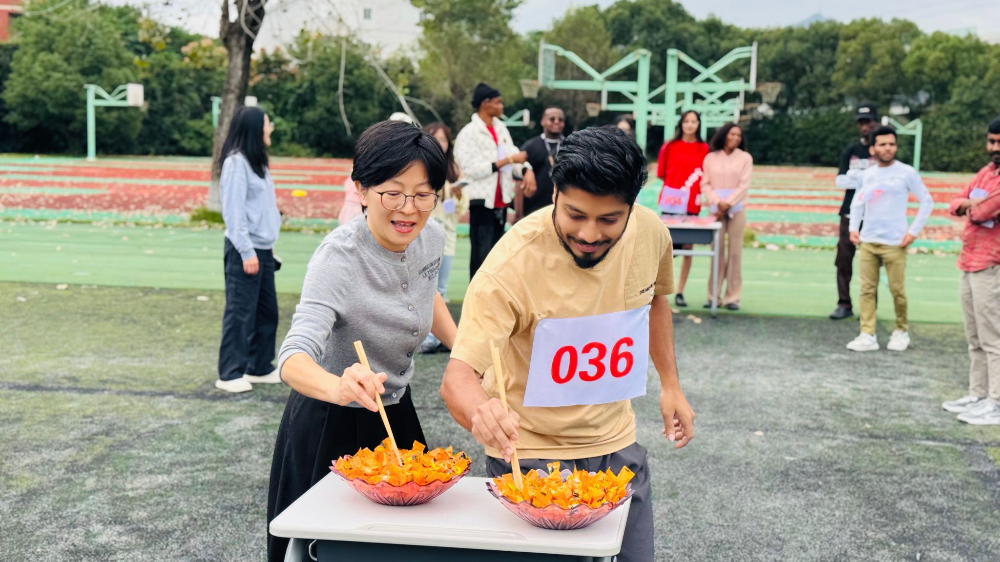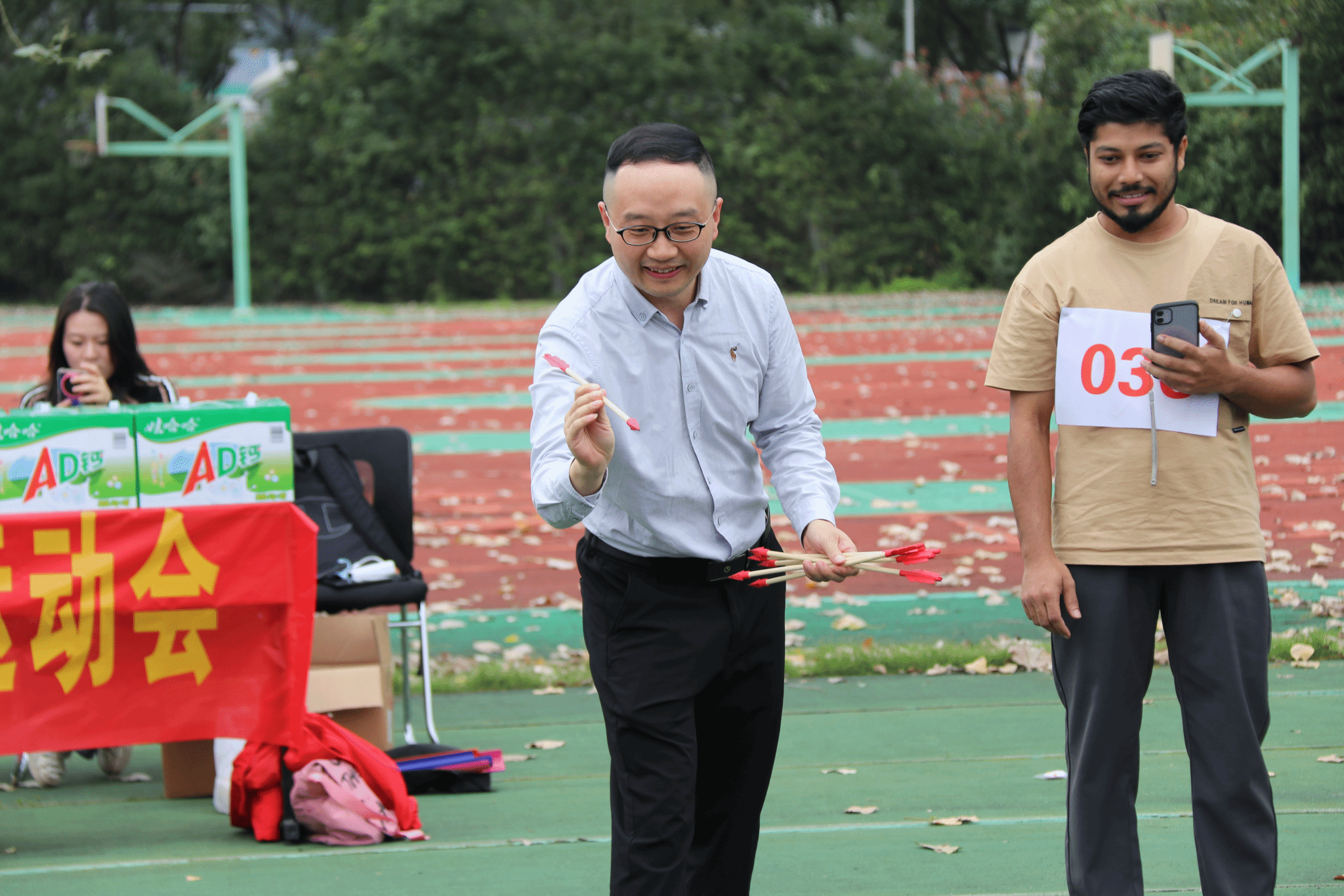 趣味运动会同样精彩纷呈。摸石过河项目中,国际学生们小心翼翼地挪动步伐,力求在保持平衡的同时快速前进,现场加油声、欢呼声此起彼伏。趣味投壶处,大家全神贯注,瞄准壶口,轻轻投出手中的箭,每一次命中都引来一阵喝彩。夹糖大作战环节,选手们争分夺秒,用筷子巧妙地夹起糖果,紧张而又刺激。此外,还有飞盘大作战、拔河比赛、心心相印、珠行万里等团体赛,整个校园都沉浸在这热烈而欢快的氛围之中。