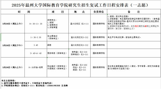 (4)外语听力及口语的测试环节,根据《温州⼤学研究⽣招⽣复试中外语听⼒及口语测试实施⽅案》,对每位考⽣单独进⾏听⼒及口语测试,当场给出测试成绩,考⽣最后得分为该测试小组所有考官给定成绩的平均分。外语听⼒口语测试满分10分,直接进入复试成绩。